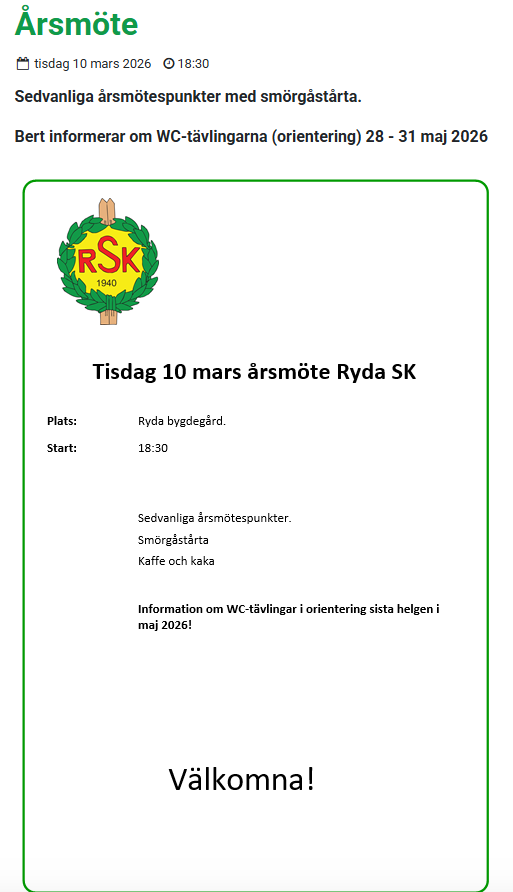 Du inbjuds härmed till ett informationsmöte om World Cup-tävlingarna söndagen den 14 december kl 13.30 i Ryda Bygdegård. Då kommer Magnus Södervall eller någon annan från tävlingsledningen att informera om tävlingarna och arbetsuppgifter för oss i Ryda SK.